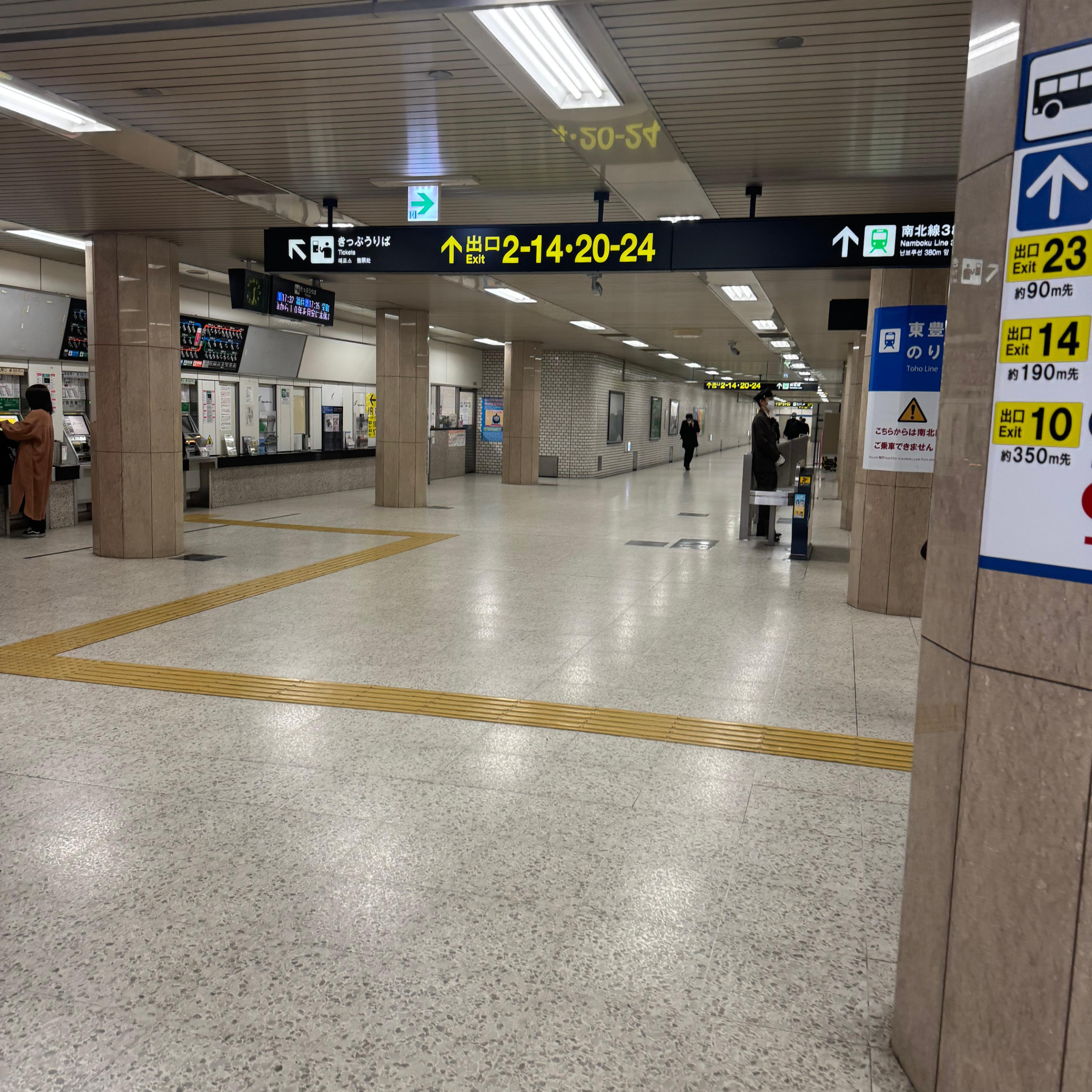 개찰구를 나오면 지하철 도호선으로 가는 방향을 알려주는 화살표가 그려진 표지판이 보이는데