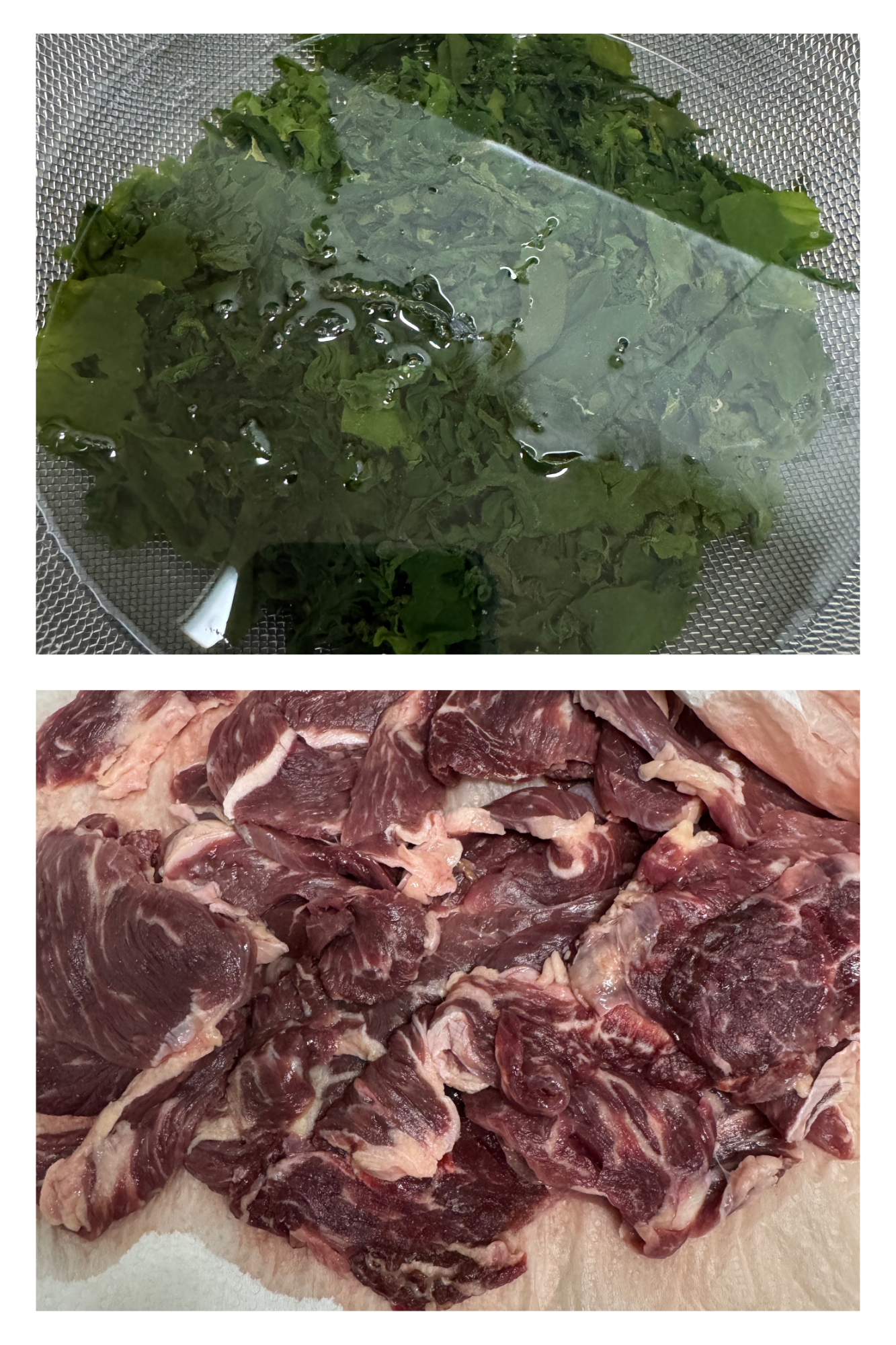 미역은 채에 받쳐서 불려두고 불린물은 남겨 둡니다.