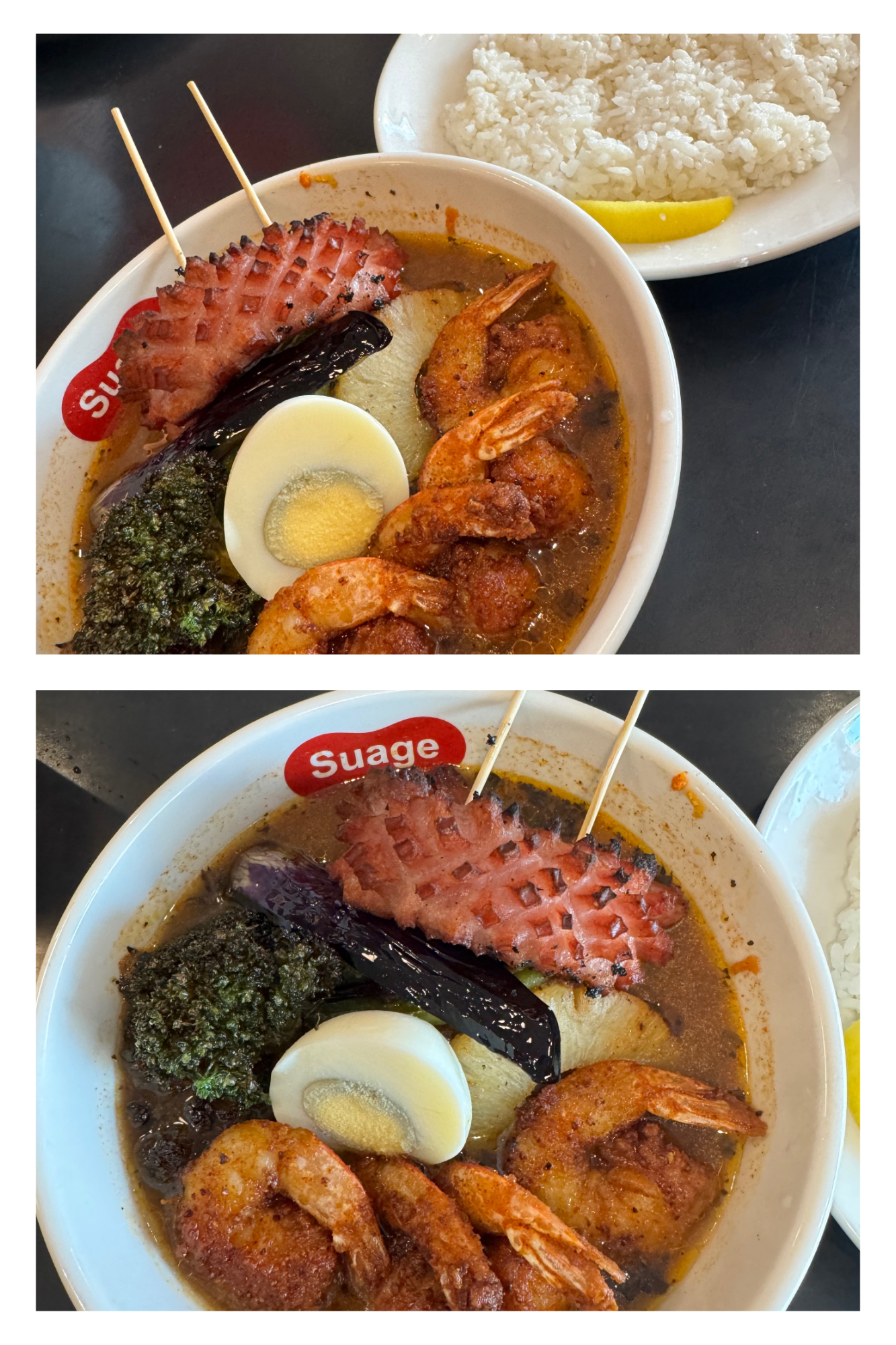 튀기거나 구운 재료들을 스프카레와 함께 먹으니