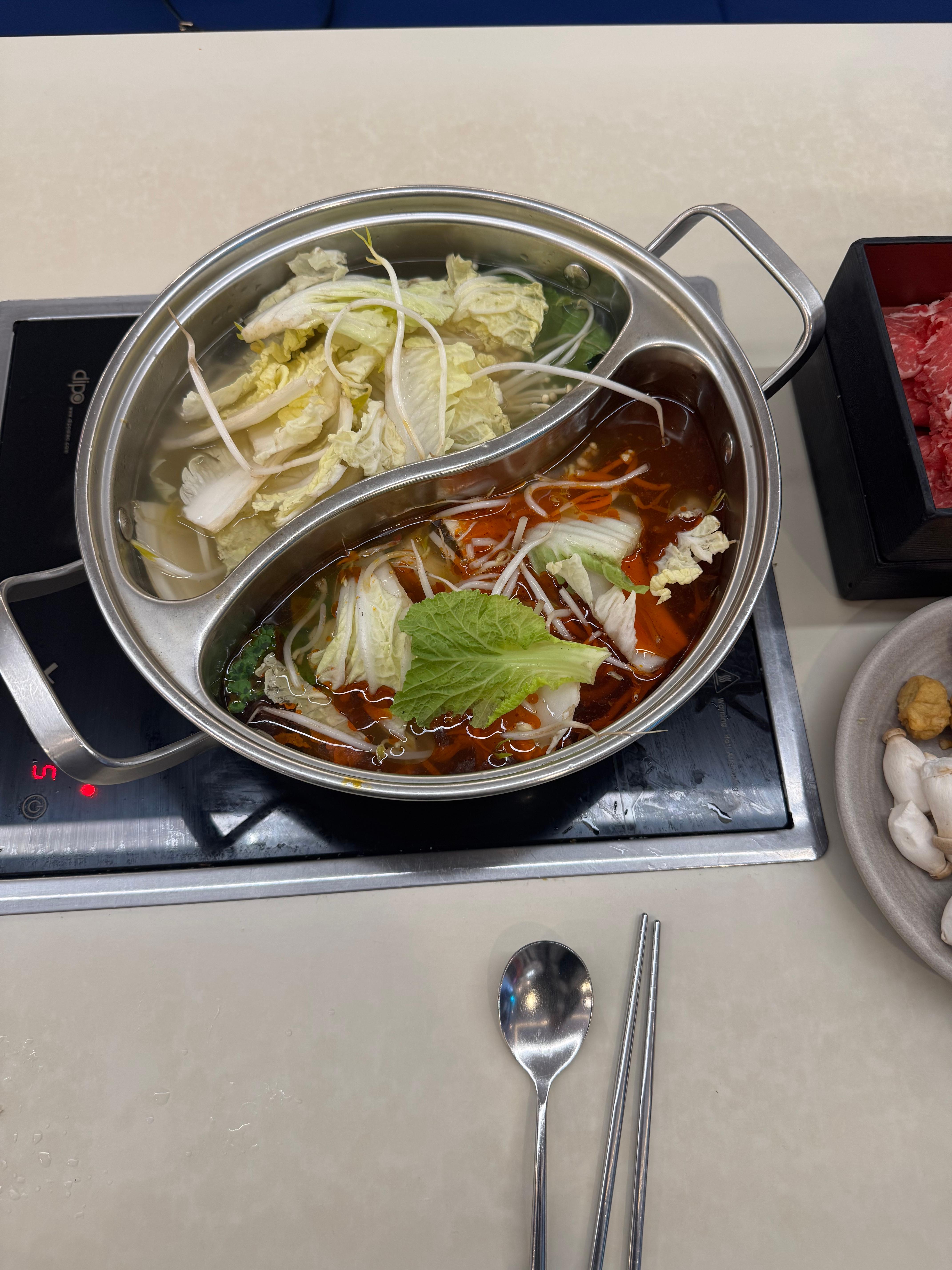 저와 친구는 반반 훠궈 소고기 무한리필로 계산 했어요.